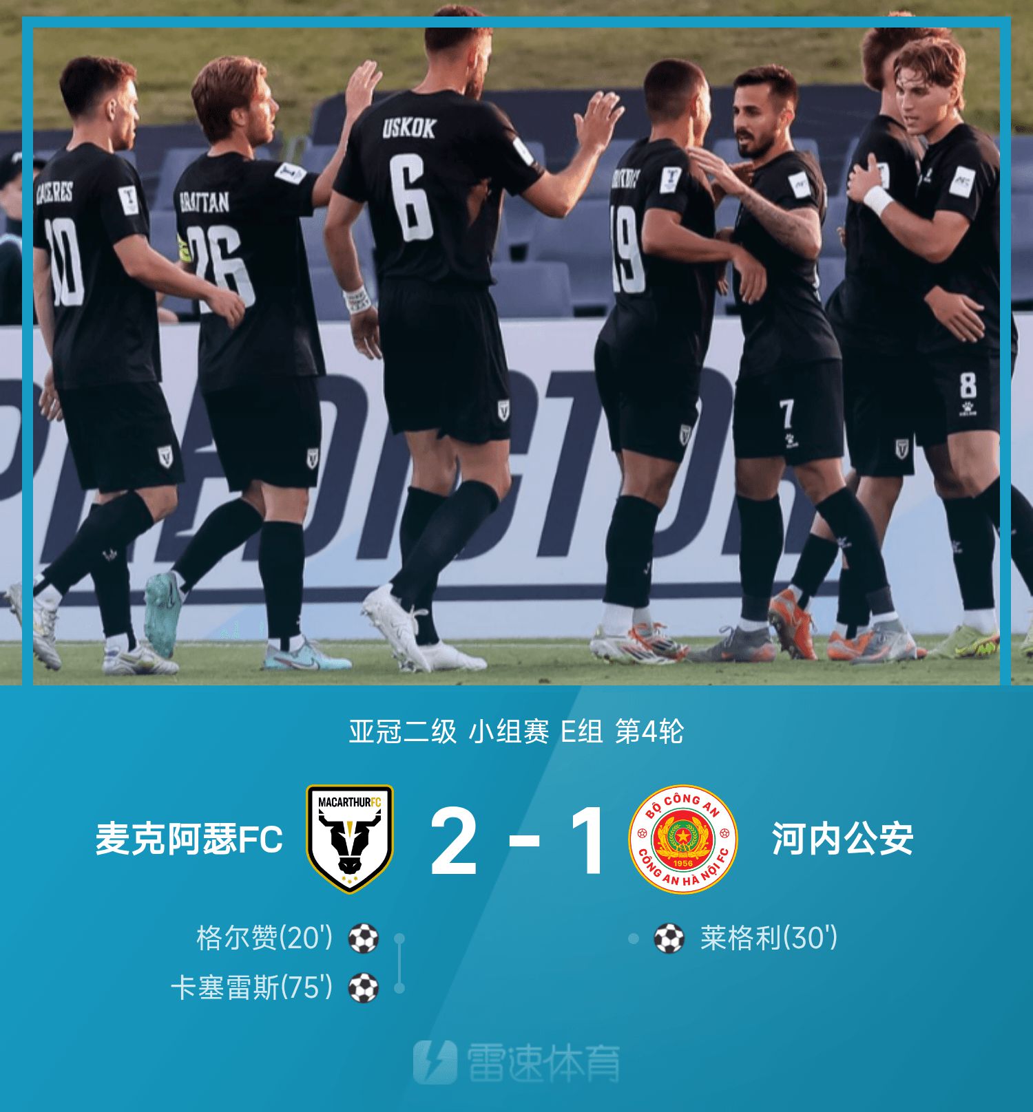 6686 Sports đưa tin ngày 6/11, ở lượt trận thứ 4 bảng E giải hạng hai AFC Champions League 25/26, đội chủ nhà Macarthur FC đã đánh bại Công an Hà Nội với tỷ số 2-1. Hiệp một trận đấu, Gerzan mở tỉ số cho MacArthur, Legli gỡ hòa, hai bên hòa 1-1; Sang hiệp hai, Caceres ghi bàn ấn định chiến thắng. MacArthur dẫn đầu bảng với 7 điểm, trong khi Hà Nội vẫn đứng thứ 2 bảng với 5 điểm.