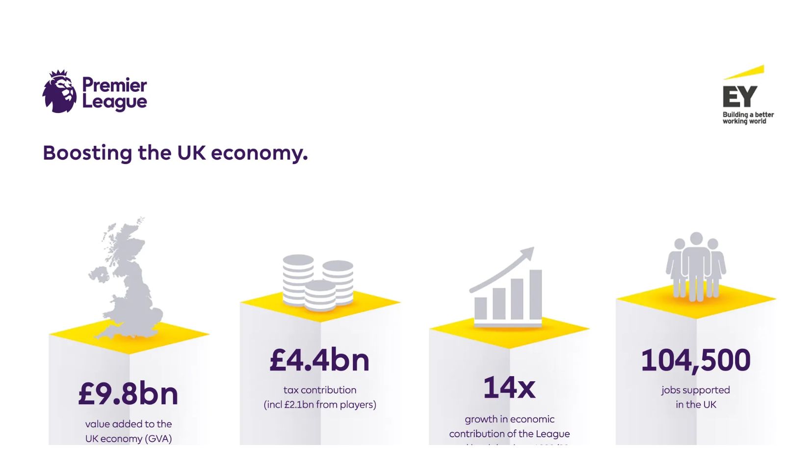 Đánh giá của Ernst & Young cho mùa giải 2023/24 cho thấy Premier League và các câu lạc bộ của nó đã tạo ra giá trị bổ sung 9,8 tỷ bảng cho nền kinh tế Anh. Con số này tăng 21% so với mùa giải 2021/22 và cao hơn 14 lần so với mùa giải 1998/99. Nghiên cứu cũng cho thấy các trận đấu ở Premier League tạo ra hơn 100.000 việc làm toàn thời gian và đóng góp 4,4 tỷ bảng tiền thuế, bao gồm 2,1 tỷ bảng từ cầu thủ và nhân viên - doanh thu giúp tài trợ cho các dịch vụ công trên khắp Vương quốc Anh.