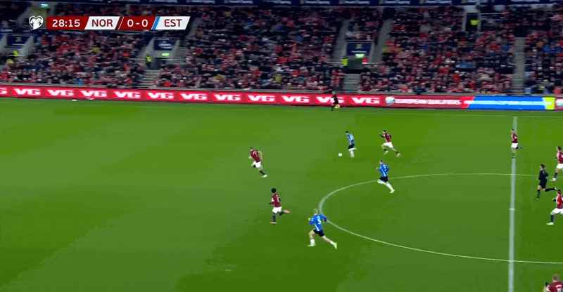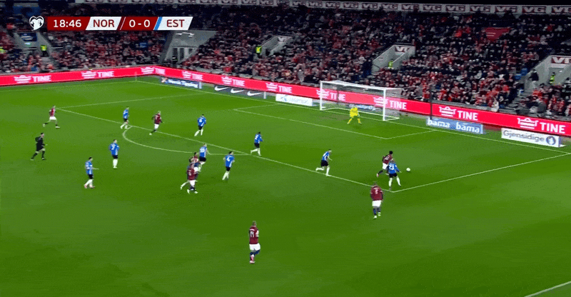 19' Haaland đánh đầu ngược, Berg bám theo và lao lên dẫn trước nhưng Hein đã chạm tới giới hạn và cản phá cú sút