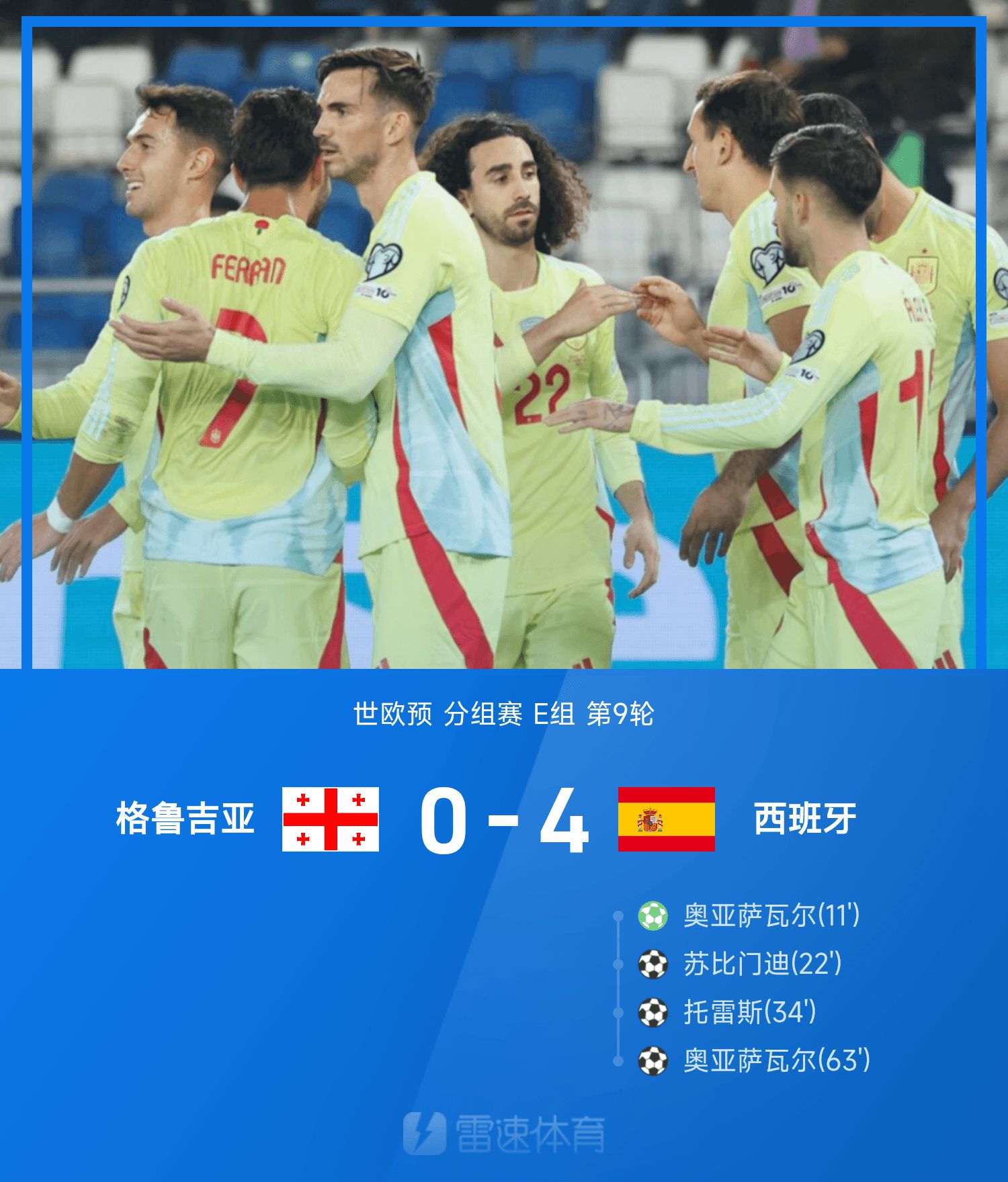 6686 Sports đưa tin ngày 16/11 rằng ở lượt 9 bảng E Vòng sơ loại châu Âu thế giới, Georgia thi đấu với tư cách là đội chủ nhà gặp Tây Ban Nha. Trong nửa đầu mùa giải này, Oyarzabal mở tỷ số bằng quả phạt đền ở cự ly 12m, Subimendi ghi bàn bằng một cú sút duy nhất, còn Torres nhận đường chuyền ngang trước khung thành rồi đẩy vào góc xa. Sau khi đổi bên và đánh nhau trở lại, Oyarzabal nhận đường chuyền của Torres và ghi bàn trong vòng cấm. Trận đấu kết thúc, Tây Ban Nha 4-0 Georgia. Sau vòng đấu này, Tây Ban Nha đứng nhất bảng với 15 điểm, còn Türkiye đứng thứ hai bảng với 12 điểm. Hai đội gặp nhau ở vòng chung kết.