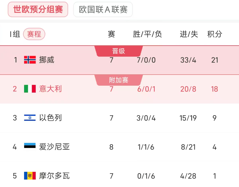 Ở bảng I, Na Uy hiện đứng nhất với 21 điểm, Ý đứng thứ hai với 18 điểm, Israel (9 điểm), Estonia (4) và Moldova (1) đều đã hết hy vọng cạnh tranh top 2.