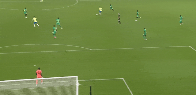 45' Khu vực ba giây của Brazil rất hỗn loạn và Ederson đã cản phá cú sút của đối thủ hai lần liên tiếp