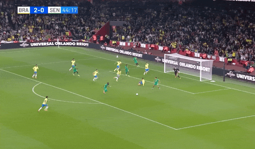 45' Khu vực ba giây của Brazil rất hỗn loạn và Ederson đã cản phá cú sút của đối thủ hai lần liên tiếp
