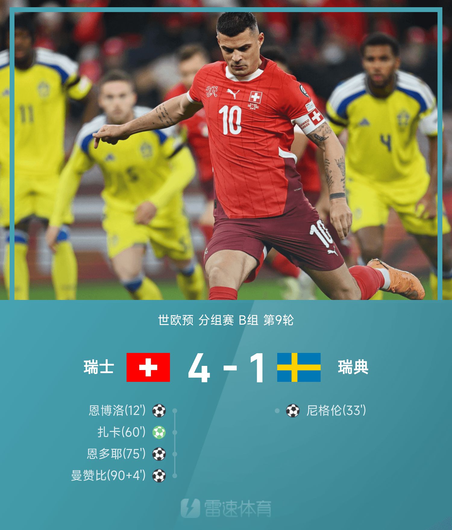 6686 Sports đưa tin ngày 16/11 rằng ở lượt trận thứ 9 bảng B Vòng loại khu vực châu Âu thế giới 2026, đội chủ nhà Thụy Sĩ đã đánh bại Thụy Điển với tỷ số 4-1. Trong nửa đầu trận đấu, Embolo mở tỉ số cho Thụy Sĩ, và Nygren sút tung lưới gỡ hòa; Trong nửa sau của trận đấu, Xhaka ghi bàn bằng một cú sút, Ndoye thực hiện đường chuyền, và Manzambi ghi bàn đóng băng trên chiếc bánh. Thụy Sĩ dẫn đầu với 13 điểm với 4 trận thắng và 1 trận hòa. Kosovo, đội đứng sau đội dẫn đầu, có 3 điểm. Họ cũng dẫn đầu về hiệu số bàn thắng bại và nắm chắc quyền chủ động giành quyền tham dự World Cup tại Mỹ, Canada và Mexico.