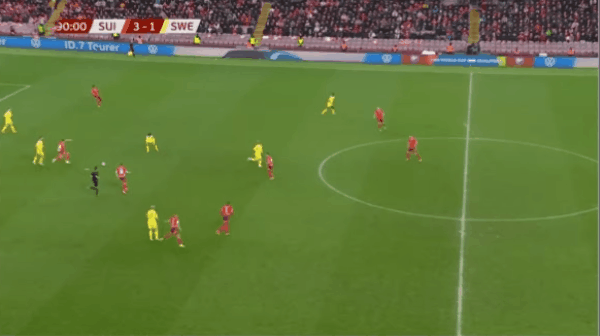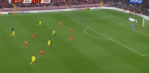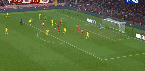 61' Embolo đột nhập vào khu vực ba giây sau khi cướp bóng, nhưng bị thủ môn chặn lại từ vạch cuối sân