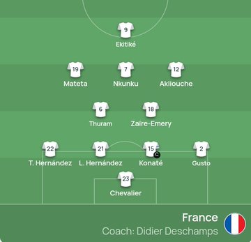 Đội tuyển Pháp xuất phát: 23-Chevalier, 22-Theo, 21-Lucas, 15-Konate, 2-Gusteau, 6-Thuram, 18-Emery, 19-Matteta, 7-Nkunku, 12-Akli Ushe, 9-Ekitiq
