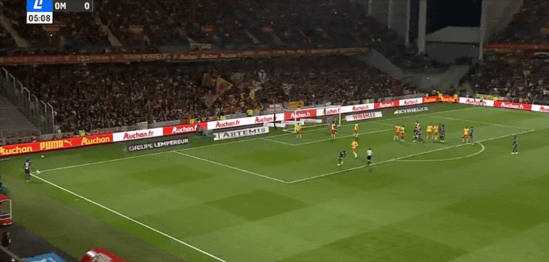 6' Marseille tấn công bằng đường biên, Greenwood sút trượt trước khung thành và bị việt vị