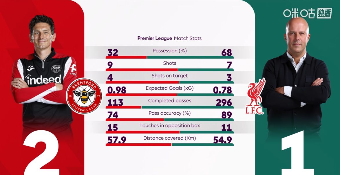 Về thống kê hiệp một, Liverpool dẫn đầu rõ ràng về rê bóng, chuyền và nhận bóng, v.v., nhưng lại kém đối thủ về số bàn thắng ghi được, số cú sút trúng khung thành và số lần chạm bóng trong khu vực ba giây. Và trong suốt trận đấu, chiến thuật ném biên mạnh mẽ của thủ môn Brentford nhiều lần đe dọa Liverpool và dẫn đến bàn thua đầu tiên ngay trong giai đoạn mở màn.