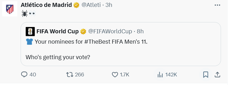 Câu lạc bộ đã chuyển tiếp danh sách do FIFA công bố trên mạng xã hội chính thức của mình và thêm hai biểu tượng cảm xúc - một con nhện (biệt danh của Alvarez là Little Spider) và một đôi mắt mở to, truyền tải một cách ngầm nhưng mạnh mẽ những nghi ngờ của họ.
