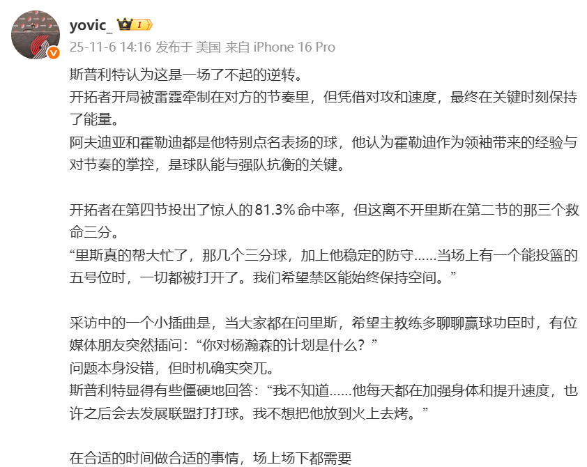 Theo người truyền thông @yovic_, sau trận đấu, huấn luyện viên tạm quyền của Trail Blazers Split đã nói về Yang Hansen: "Yang Hansen đang tăng cường thể lực và cải thiện tốc độ mỗi ngày. Anh ấy có thể đến Development League để thi đấu. Tôi không muốn đốt cháy anh ấy."