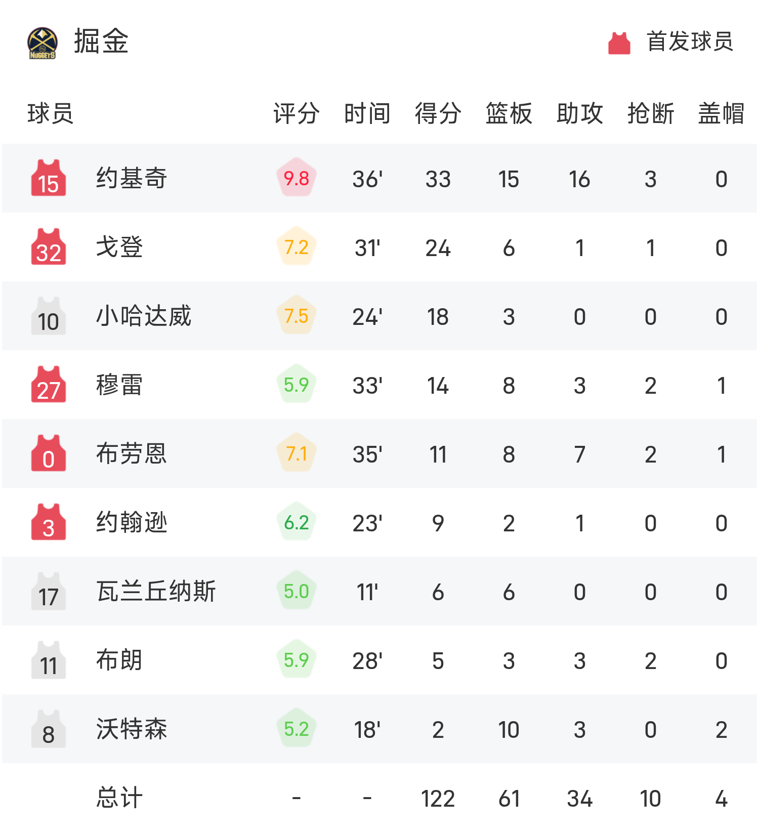 Jokic đã ghi được 33 điểm cao nhất trận, 15 rebound và 16 kiến tạo, đưa Nuggets đến chiến thắng.
