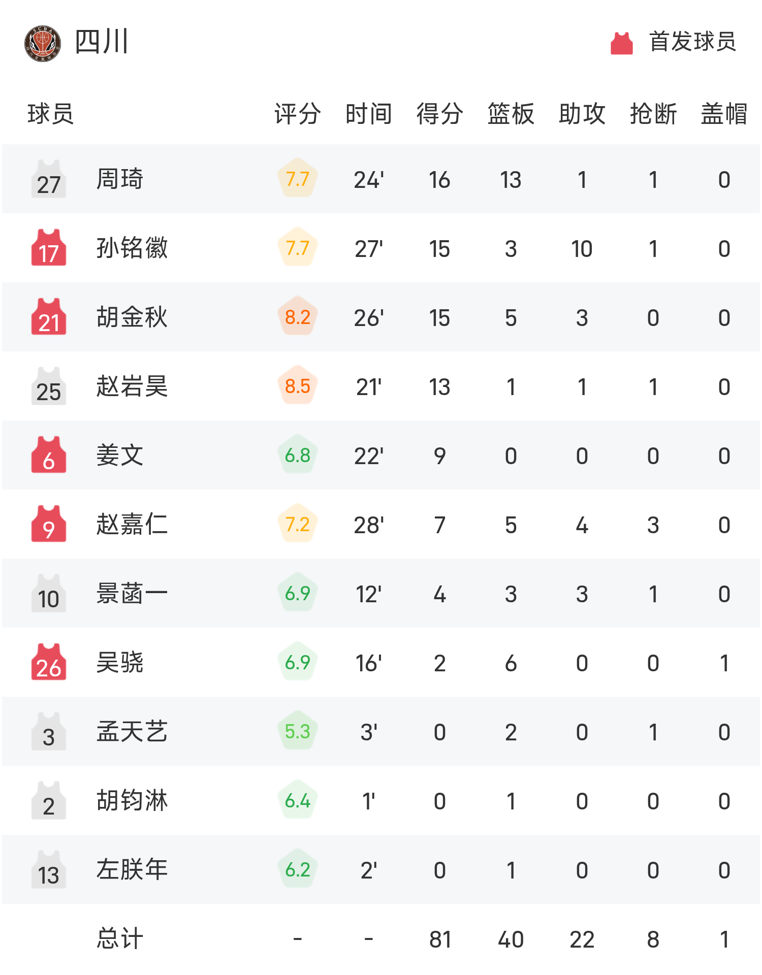 Zhou Qi ghi 16 điểm, 13 rebound và 1 kiến tạo để dẫn dắt đội đến chiến thắng. Yu Zechenkong ghi được 17 điểm cao nhất trận và 2 rebound. Cầu thủ kỳ cựu Han Dejun mở màn điệu nhảy cuối cùng và giành được 16 rebound.