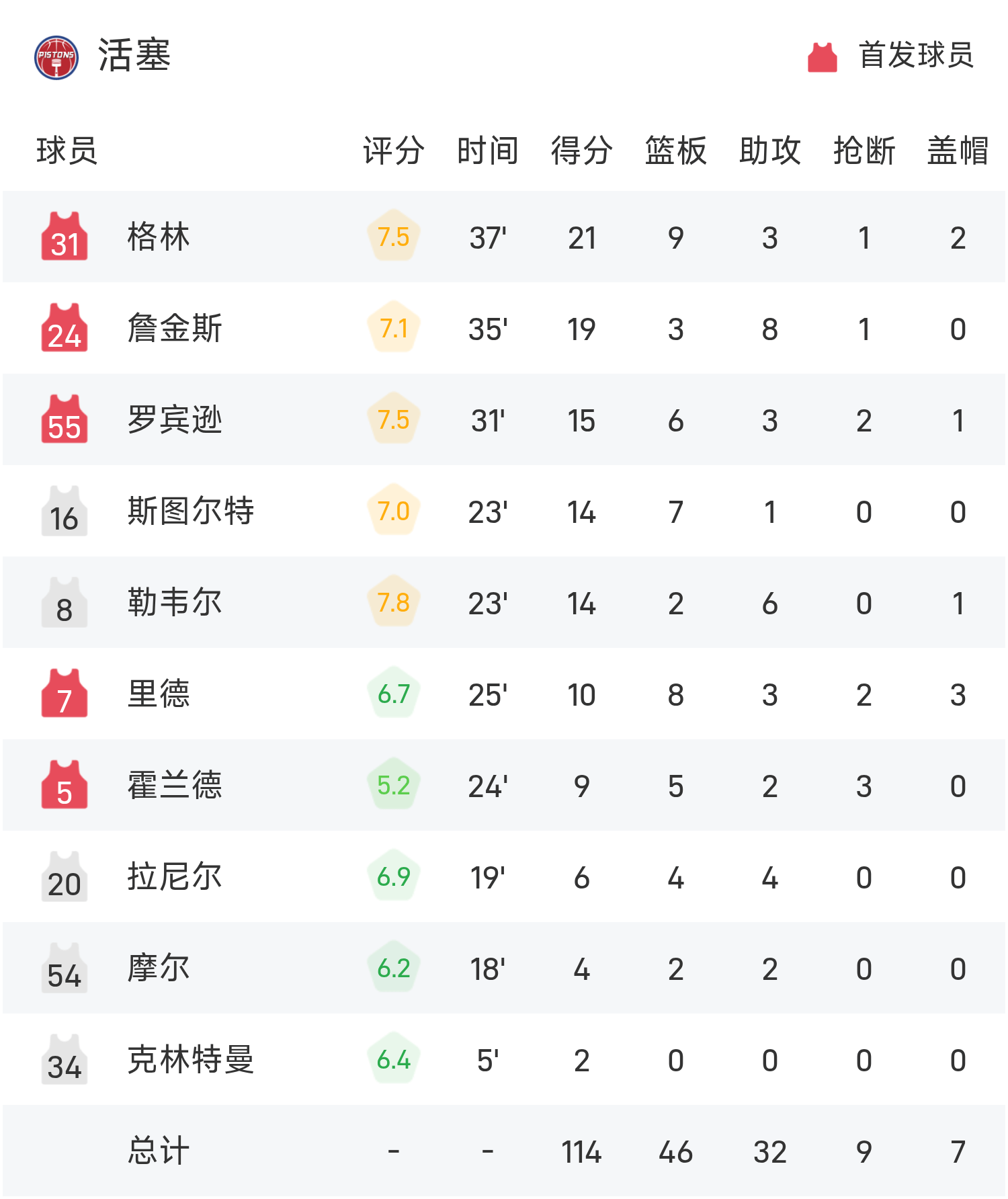 6686 Thể thao Tin tức ngày 15 tháng 11 Trong trận đấu vòng bảng NBA Cup mùa giải thường lệ 25/26, đội Pistons đối mặt với 76ers. Kết thúc trận đấu, Pistons đánh bại 76ers với tỷ số 114-105. Green ghi 21 điểm, 9 rebound và 3 kiến tạo để dẫn dắt đội đến chiến thắng. Maxi ghi được 31 điểm cao nhất trận, 7 rebound và 3 kiến tạo.