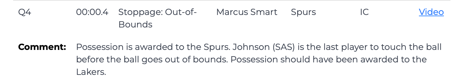 Trong 0,4 giây cuối cùng, trước khi bóng đi ra ngoài biên, Keldon Johnson là người cuối cùng chạm bóng nhưng trọng tài đã gọi Smart và bóng đi ra ngoài biên, bóng được trao cho Spurs. Đây là một phán quyết không chính xác và lẽ ra quả bóng phải được trao cho Lakers.