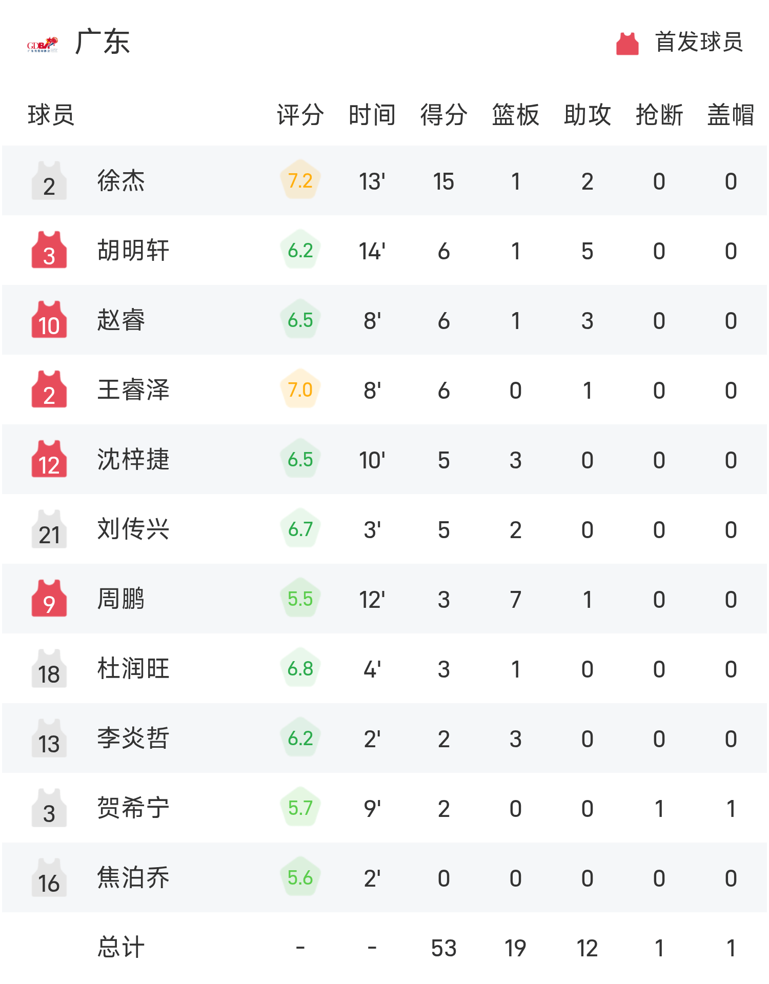 Cầu thủ dự bị của Quảng Đông Xu Jie ghi được 15 điểm, 1 rebound và 2 kiến tạo, còn tiền đạo xuất phát Zhu Junlong của Chiết Giang ghi được 13 điểm, 5 rebound và 3 kiến tạo.