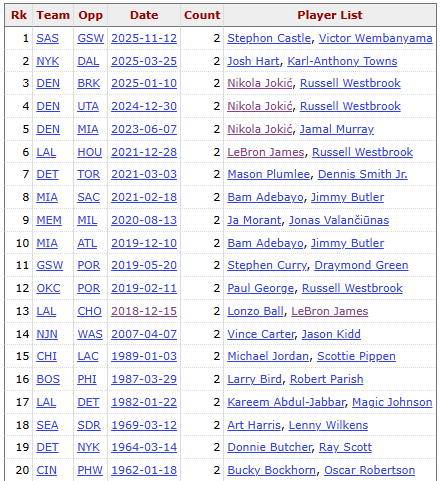 Bao gồm cả Bunyama và Castle ngày nay, đã có 20 điều kỳ diệu trong lịch sử NBA khi các cầu thủ trong cùng một đội ghi được triple-double cùng một lúc. Trong số đó, vua triple-double Westbrook tham gia nhiều nhất 4 lần, còn Jokic tham gia 3 lần, xếp thứ hai. Cả hai đã hai lần ghi được cú triple-double trên cùng một sân và họ là cặp đôi duy nhất trong lịch sử. James đã tham gia vào hai trong số đó. Ngoại trừ ba người, không người chơi nào khác có thể làm được nhiều hơn một lần.