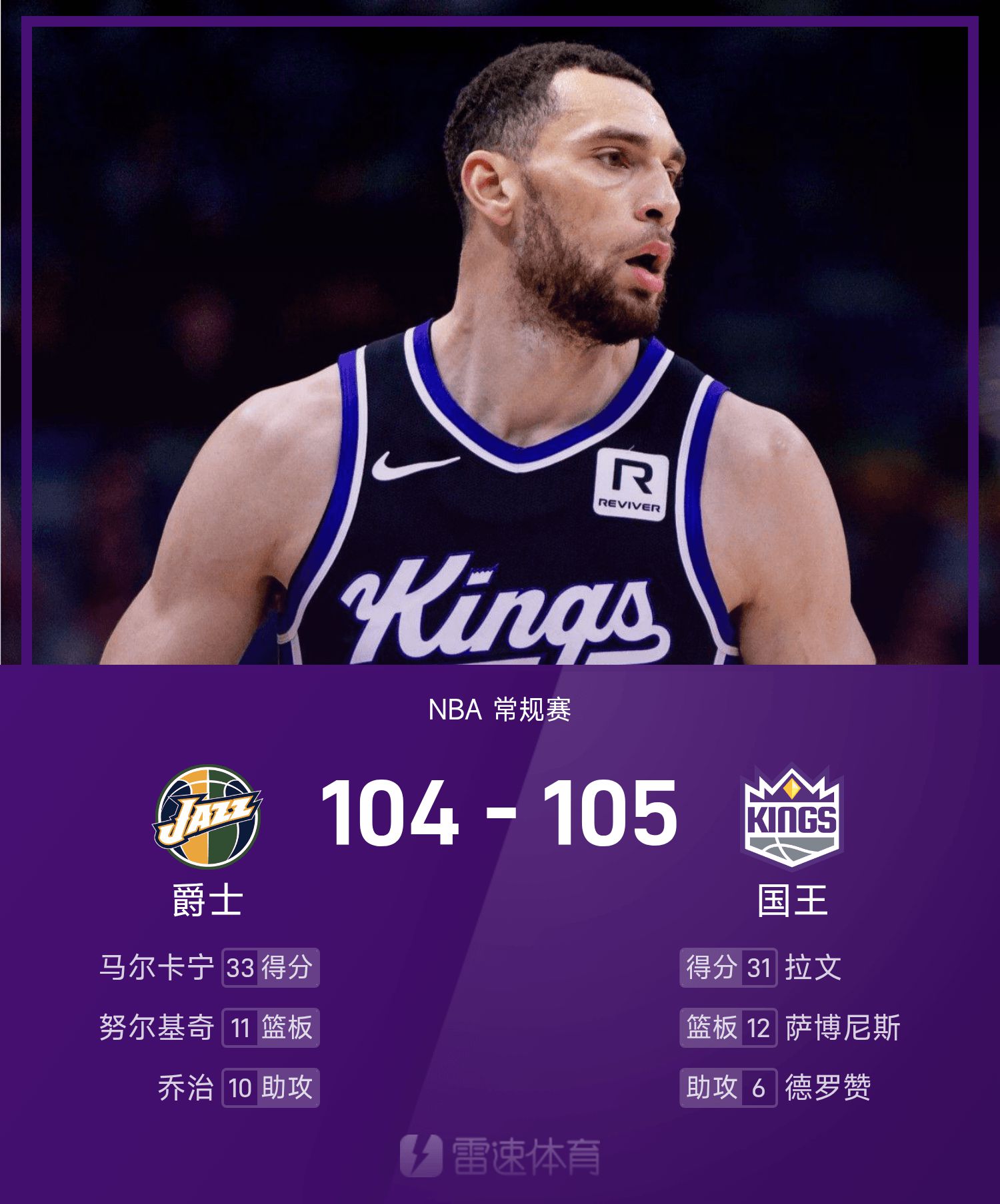 6686 Thể thao Tin tức ngày 25 tháng 10 Trong mùa giải NBA thường lệ 25/26, các vị Vua đối đầu với Jazz. Kết thúc ván đấu, Kings đánh bại Jazz với tỷ số 105-104. LaVine ghi được 31 điểm, 2 rebound và 1 kiến tạo để dẫn dắt đội của mình giành chiến thắng. Markkanen ghi được 33 điểm cao nhất trận, 4 rebound và 1 kiến tạo.