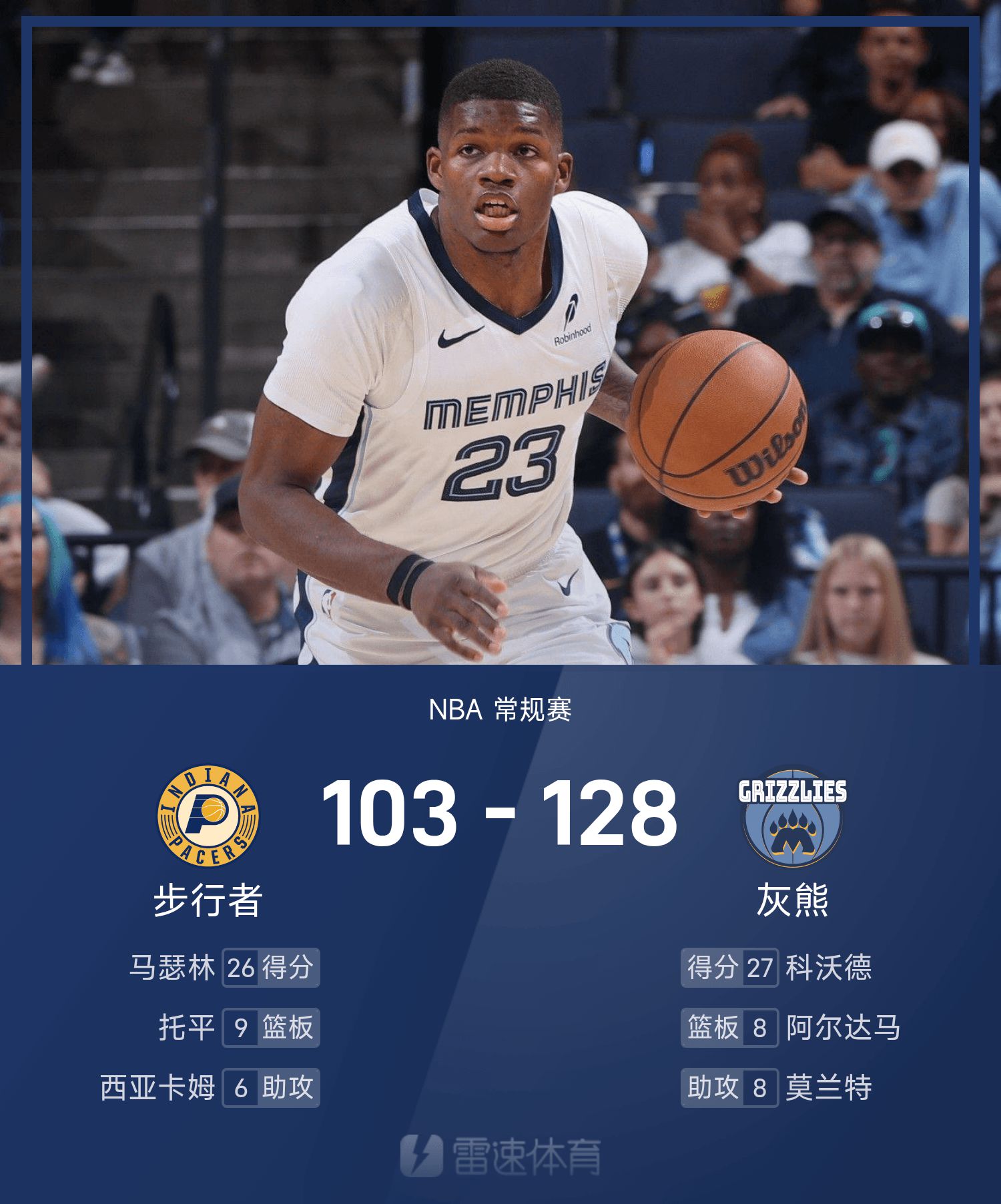 Cuối trận, Grizzlies đánh bại Pacers với tỷ số 128-103.